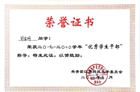 校“优秀共青团员”;校“三好学生”;校“优秀学生干部”;校暑期社会实践“先进个人”;人民奖学金“三等奖”等表彰若干。