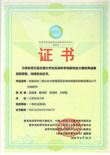 互联网+大学生创新创业大赛第五届“建行杯”国赛选拔赛暨第八届“花桥国际商务城杯”省赛“高教主赛道”赛道二等奖;