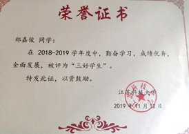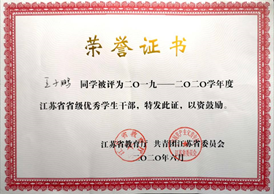 人民奖学金一等、团中央三下乡社会实践“千校千项”入选、扬中市暑期社会实践“优秀宣讲员”、校三好学生、校志愿服务先进个人、校优秀共青团员、院十佳青年等表彰若干。