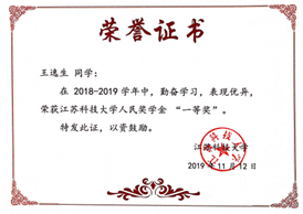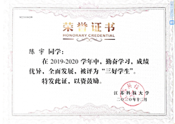 江苏科技大学二等奖学金;科普知识竞赛一等奖;“艇身而出”舰艇模型设计大赛二等奖等校级奖项;江苏科技大学“优秀学生干部”、“优秀三好学生”、暑期实践“先进个人”。