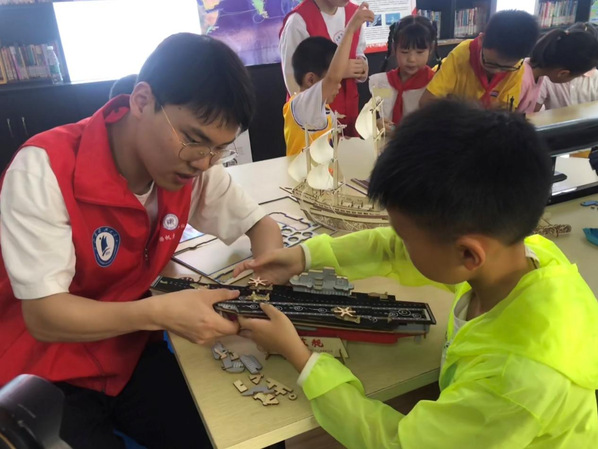 2021年7月9日,雪园足球 “筑建深蓝梦 奋斗百年路”暑期社会实践团在镇江市宝塔路街道庄泉社区开展了“图流航海,言‘船’身教”活动。实践团以航海日为契机,以饱满的精神状态向小朋友介绍我国的航海史以及现代海防科普知识,指导小朋友拼装舰船模型,感受海防科技的魅力,迎接7月11日中国航海日的到来。通过亲自实践和主动讲述等多种形式来传播船海文化,坚定海洋强国之信念,增强社会责任感,升华自身思想。