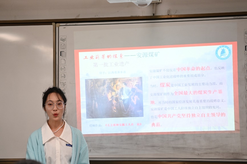 课堂上,实践团成员黄雨晴从镇江醋文化博物馆的介绍引入主题,对我国工业遗产现状进行了介绍,揭示了我国在奋进现代化新征程的过程中非常重视工业遗产的保护的实际情况。举例说明了国家在加强工业遗产科普作用,积极推动工业遗产展览馆建设等方面开展的举措。同时结合历史图片和视频,为同学们讲述了我国工业萌芽的探索阶段、工业体系建立阶段、工业大国转型阶段极具特色的代表工业遗产和其背后隐藏的红色精神。朱方路小学的学生们全神贯注地听着内容,在课堂上踊跃发言表达想法,纷纷表示要传承红色工业遗产所蕴含艰苦奋斗,自力更生等精神。