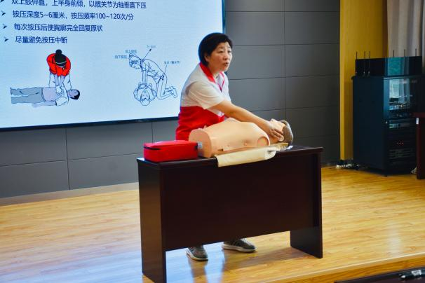 授课老师从心搏骤停的定义及表现出发,讲解心肺复苏的重要性,采用理论知识与实地操作相结合的方式,利用人体模型进行现场示范,每一个关键步骤都给同学们强调操作要点,精准位置以及规范动作,现场同学们相互探讨,认真演练,老师们给予专业性指导纠正,讲述了在何种情况下心肺复苏的实施能够产生效果,及停止的条件。张淼老师表示,自动体外除颤器的使用对提高心搏骤停患者的生存机会起到关键性作用,让同学们掌握体外自动除颤器的使用注意事项和具体操作步骤,能够在面临意外突发情况时,提供及时有效的救助。