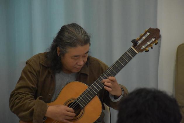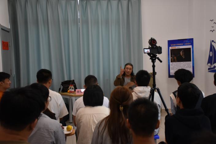 胡爱华老师向同学们讲述了自己的音乐学习历程,分享了自己在音乐人才培养、音乐大众化教育方面的经验,表达了对于大学生音乐教育及文化素质培养的感悟和追求,他讲到,音乐不仅是一种艺术形式,更是一种生活方式和情感表达,他鼓励大学生在书本知识学习和学术研究之余,要积极参加校园文化艺术活动,通过音乐艺术与心灵对话,不断提升人文素养和审美情趣,实现自我提升,将来为国家和社会做出更大的贡献。胡老师在讲述中还通过古典吉他的各类表现手法,为同学们演奏了《迪亚兹的回忆》、《娃娃的梦》、《华尔兹姑娘》等作品,带领同学们感受音乐的艺术魅力以及蕴含的情感等。在交流互动环节,胡老师结合同学们在兴趣爱好培养以及音乐学习等方面的话题,和同学们进行了热情的交流互动,部分吉他爱好者还现场展示了吉他演奏才艺。