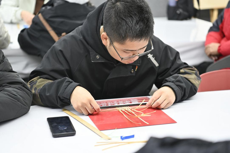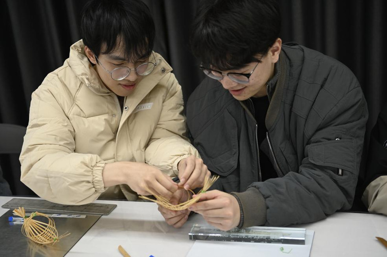 手工竹船,延续精神。同学们来到竹编体验馆,通过手工制作竹船,忆苦思甜,体验劳动人民的生活智慧。“压一送一”独特的竹编技法,让各种竹艺品得以制作。各位同学在竹编老师的带领下,成功制作出精美的竹船作品。在制作竹船的过程中,同学们通过观察制作过程、倾听老师讲解,逐渐做出属于自己的“小竹船”。请教交流,互帮互助,协作完成。