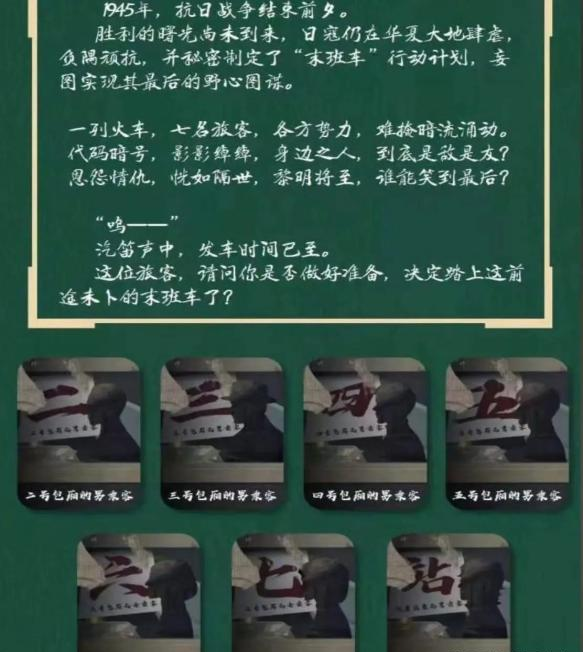 本次活动剧本名为《末班车》,其讲述的是七个少先队员在一次爱国主义活动中穿越到1945年抗战结束前夕,此时胜利的曙光并未到来,日寇仍在华夏大地肆虐。七位同学化身我党地下党员、军统各方特务等角色,在一列运送国宝的火车上展开了一场斗智斗勇的输死拼搏。党员们化身不同身份角色,穿越历史时空,最终在我党人员智勇双全的计谋下,挫败了敌人的阴谋诡计,将国宝重新送回了国家的怀抱。