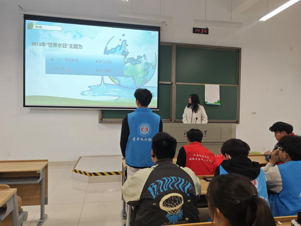 活动伊始,志愿者们在教室结合ppt向大家介绍世界水日的由来与全球水资源现状。志愿者们指出我国是全球13个人均水资源最贫乏的国家之一且三分之二的城市处于缺水状态的现状,呼吁同学们珍惜水资源,从小事做起。并与同学们进行互动交流,开展“水”知识竞答,强调水资源节约与保护的重要性