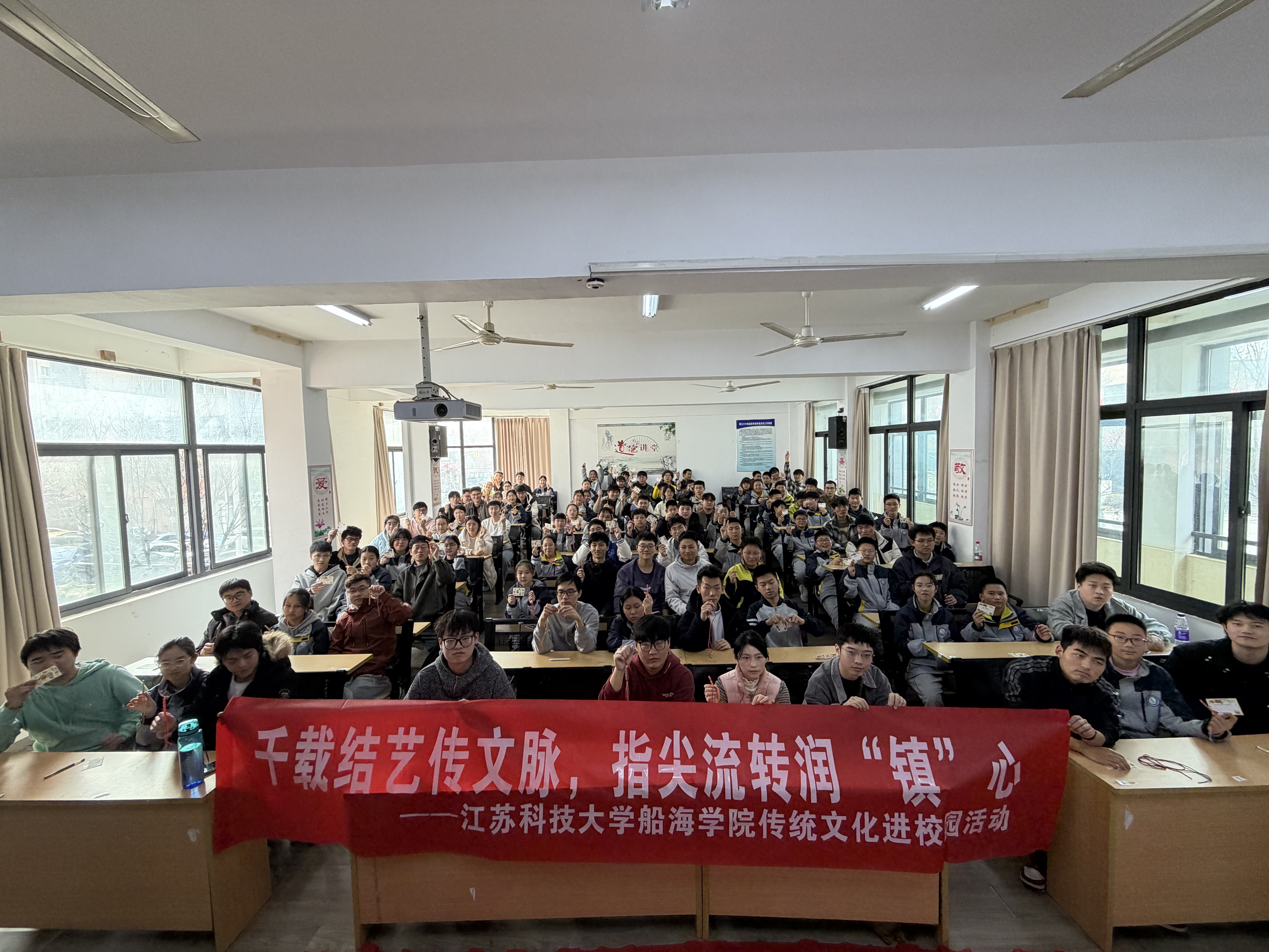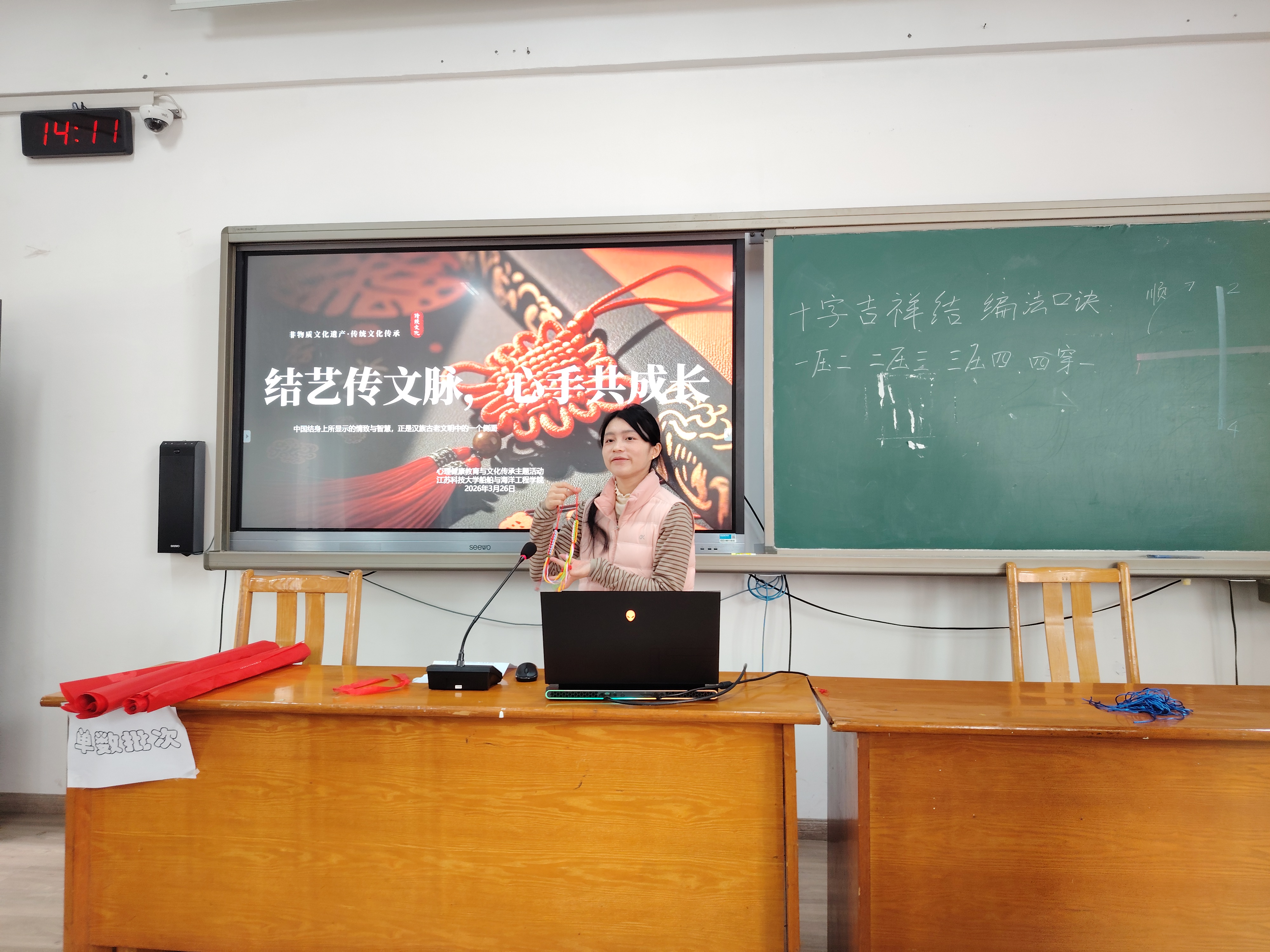 活动伊始,志愿者首先为同学们介绍了中国结的历史渊源与文化内涵,从远古时期的结绳记事到如今的吉祥装饰,一个个精巧的绳结串联起中华民族数千年的文化记忆。志愿者结合镇江本地非遗文化特色,讲解了绳结技艺在当地民俗文化中的传承脉络,让同学们深切感受到传统文化就在身边。