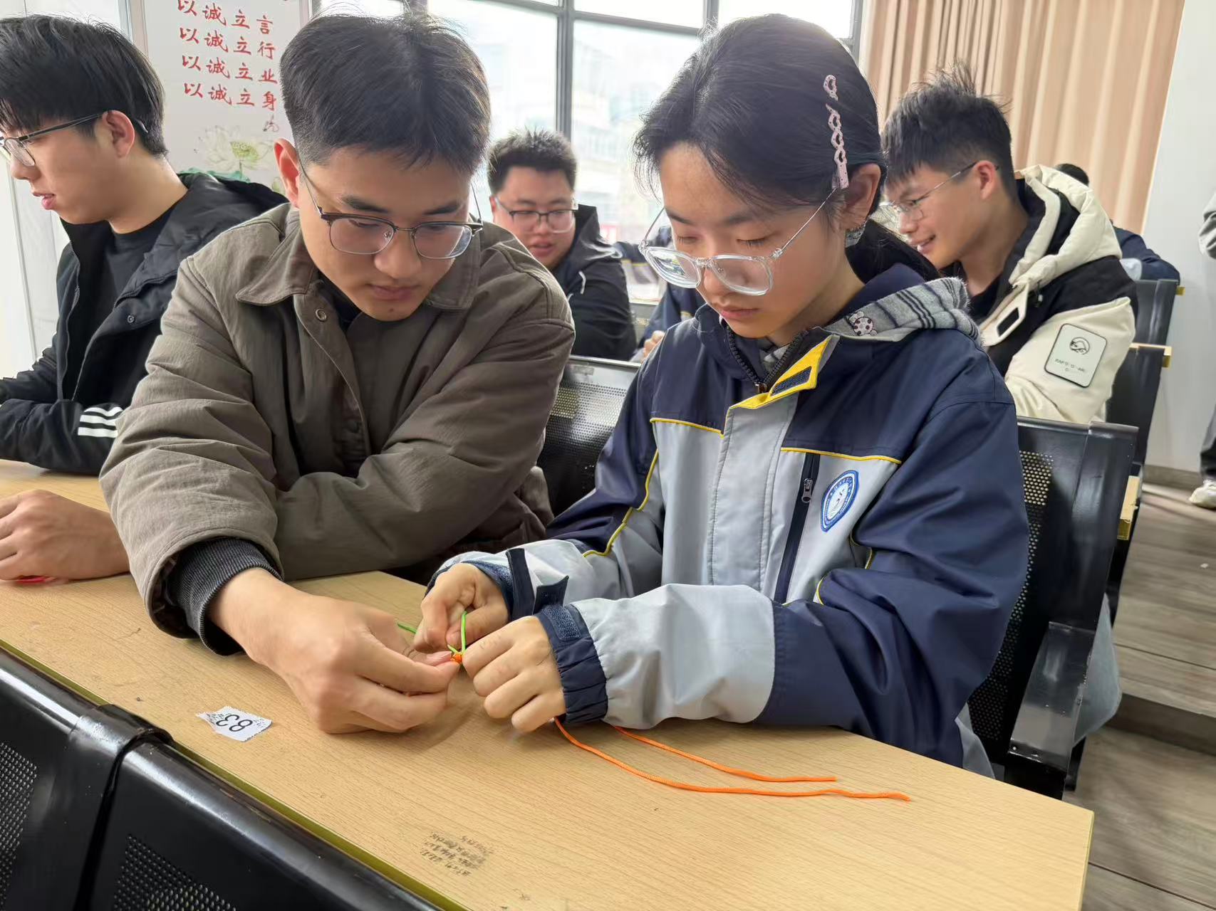 随后的实践环节中,志愿者们手把手教授七年级同学们基础平结、吉祥结的编织方法,耐心讲解“一绕、一穿、一抽”的编织技巧。同学们手持五彩绳线,在志愿者的指导下反复尝试,从最初的绳线缠绕杂乱,到逐渐掌握编织要领,一个个形态饱满、色彩鲜艳的中国结作品相继完成,大家拿着自己亲手编织的作品,脸上洋溢着自豪的笑容。